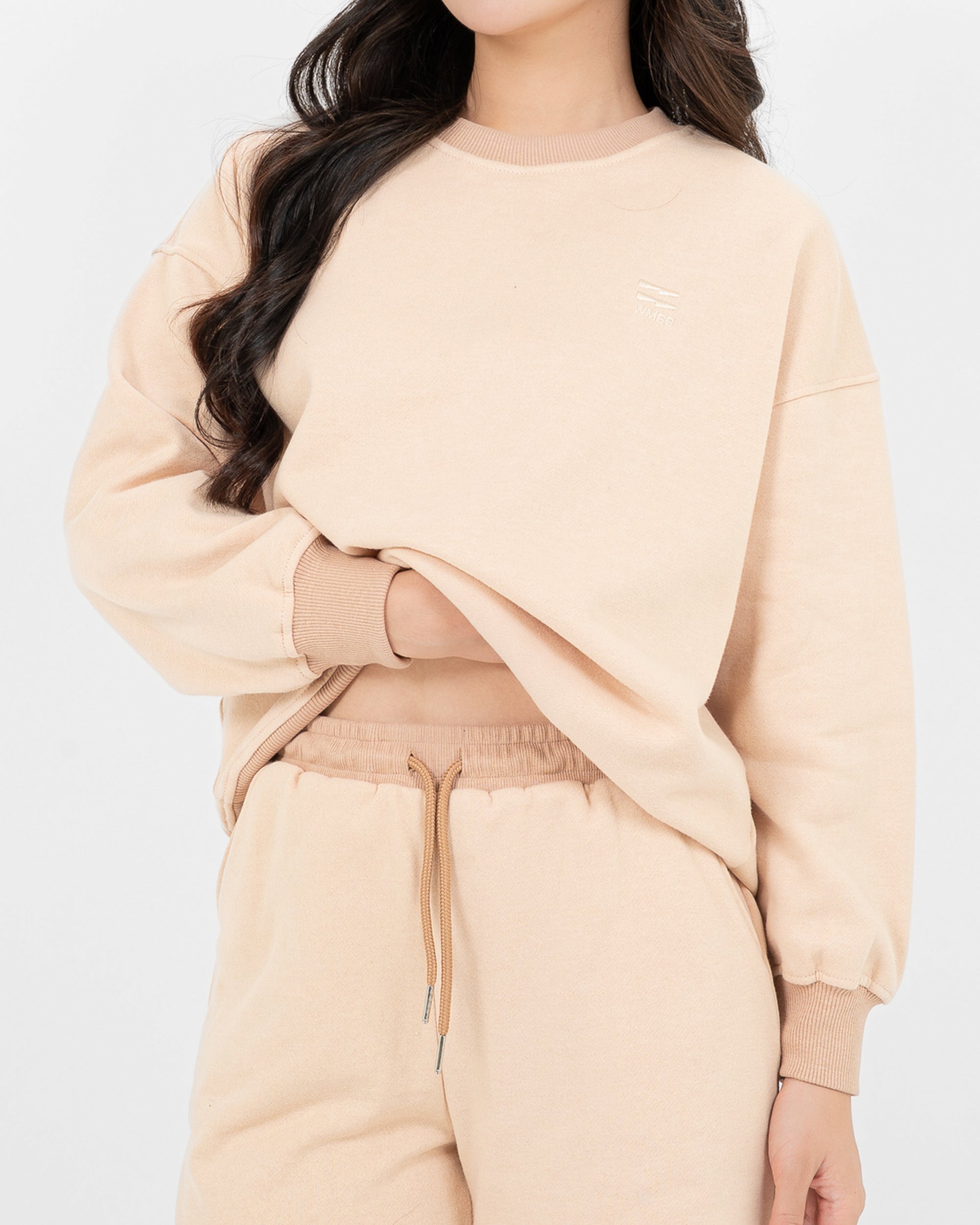 Dáng rộng + thiết kế vai trễ nhằm tạo độ thoải mái là chính, nhưng nó thêm phần phóng khoáng cho chiếc áo này. Vải nỉ bông có độ dày nhất định nhằm giữ ấm nhẹ, lý tưởng cho thời tiết mát mẻ hoặc buổi tối.